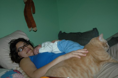Teagan joins in the family cuddle